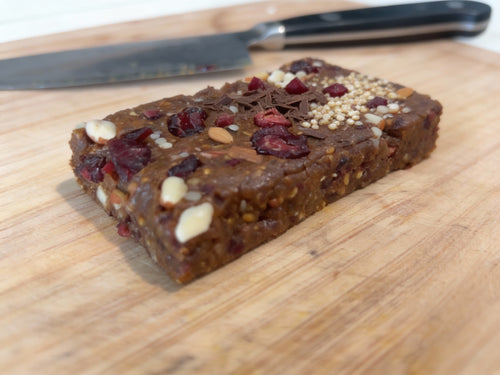Deep cacao balanced with tart cherry and a warmth of ginger. Finished with ground almond and puffed quinoa for texture. The sweetness is restrained — enough to feel genuinely satisfying, not so much that you feel you've cheated on something.